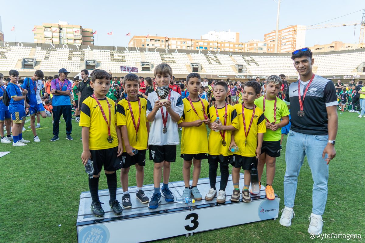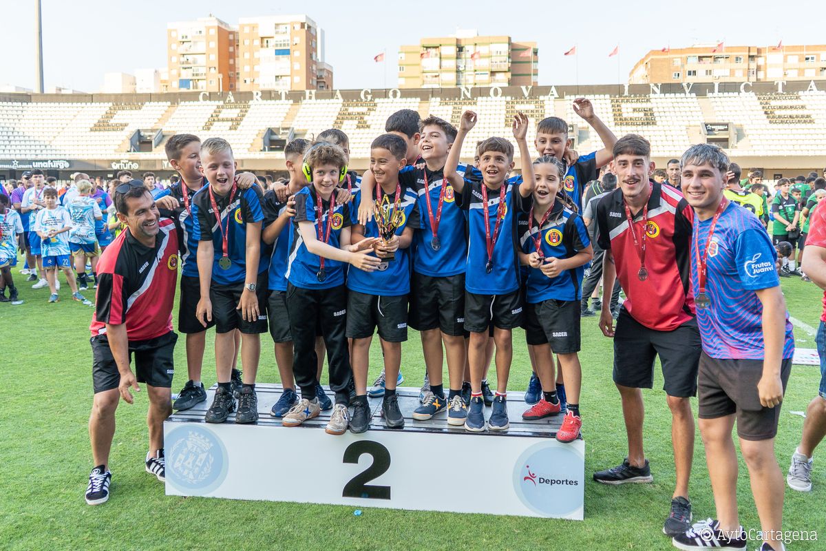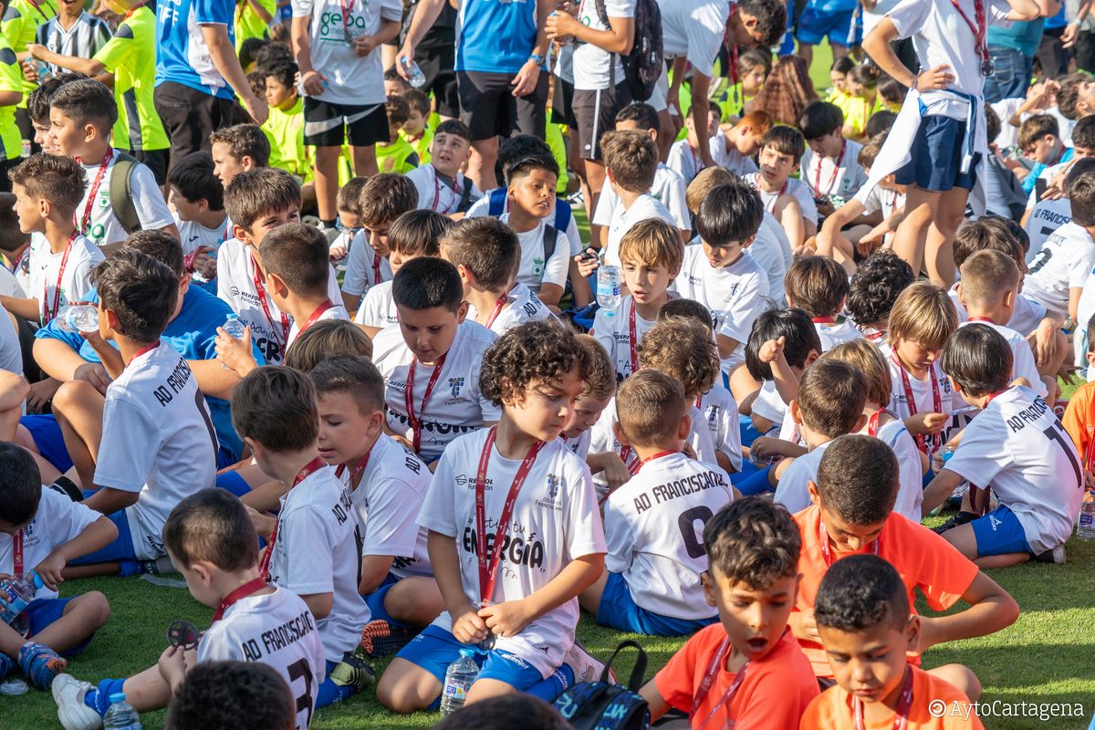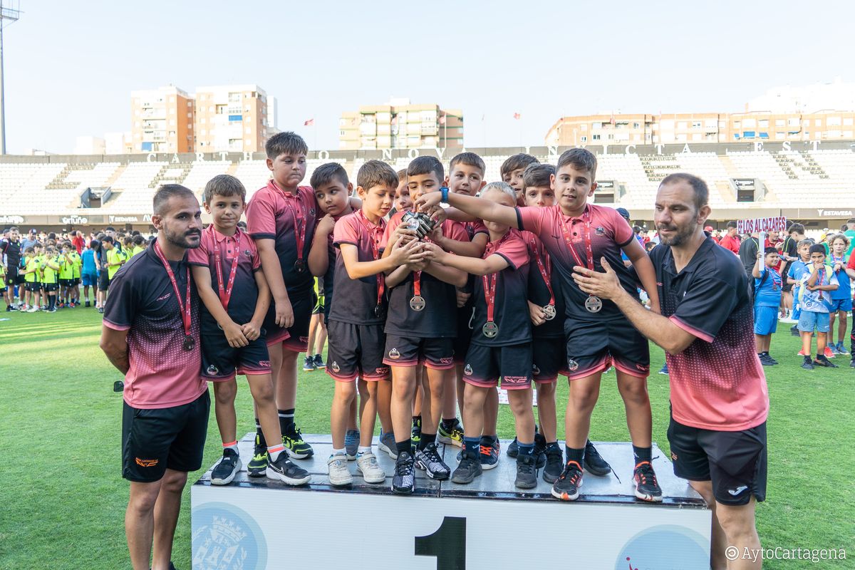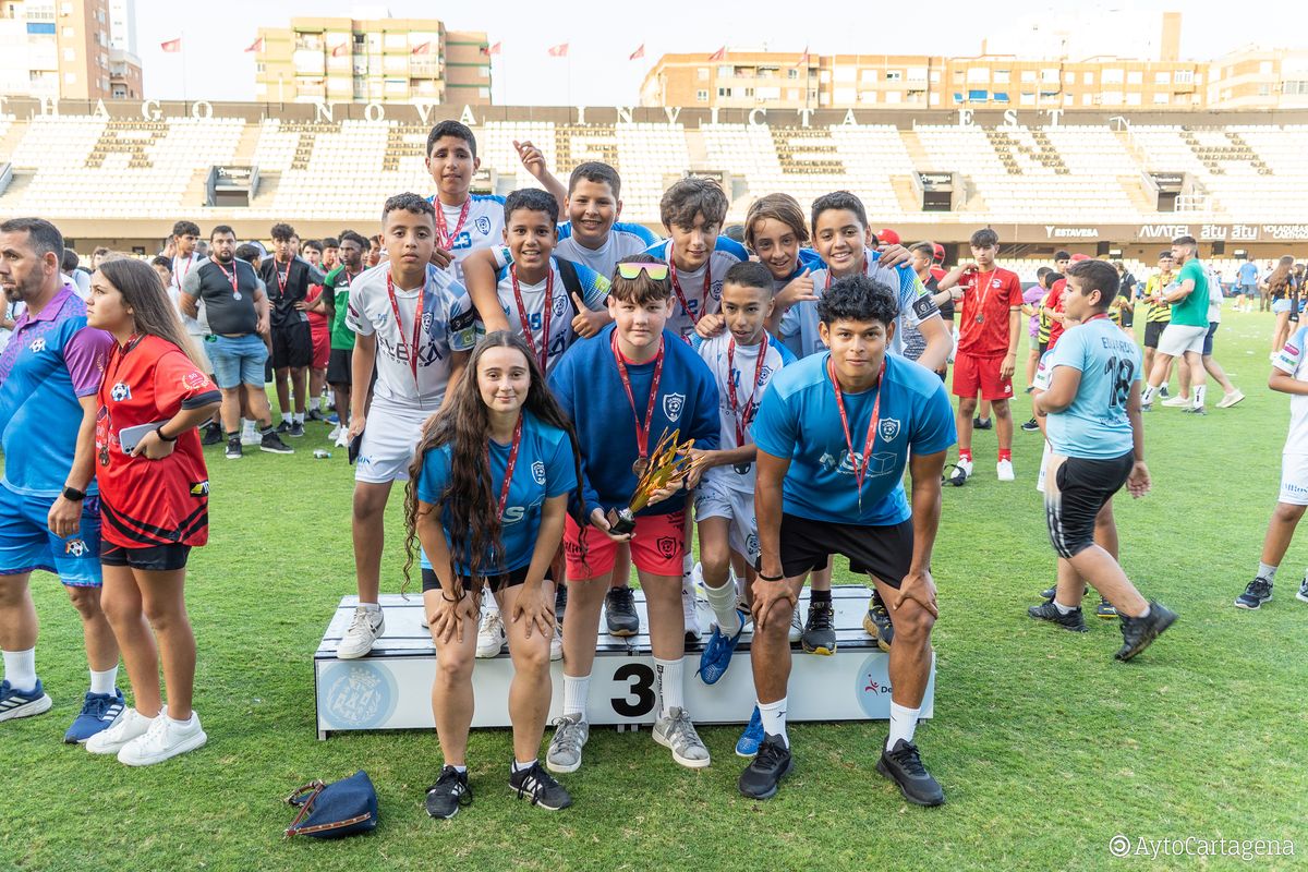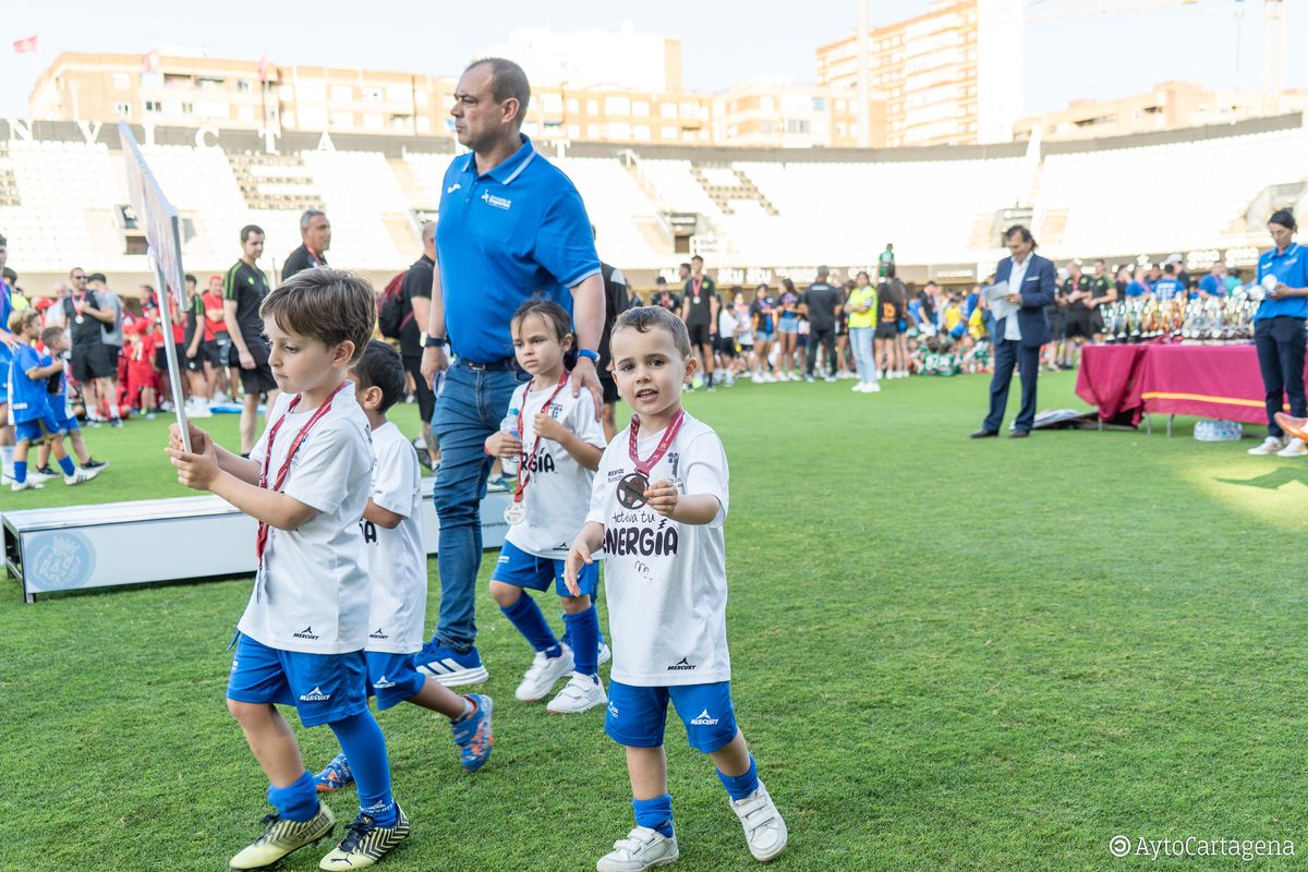 Cientos de chavales participaron en el acto celebrado este jueves en el Estadio Municipal Cartagonova, que incluyó desfiles y exhibiciones, culminando con la entrega de trofeos