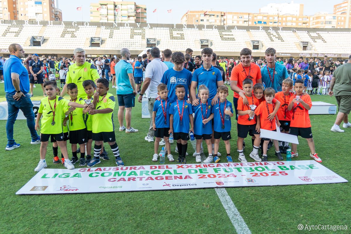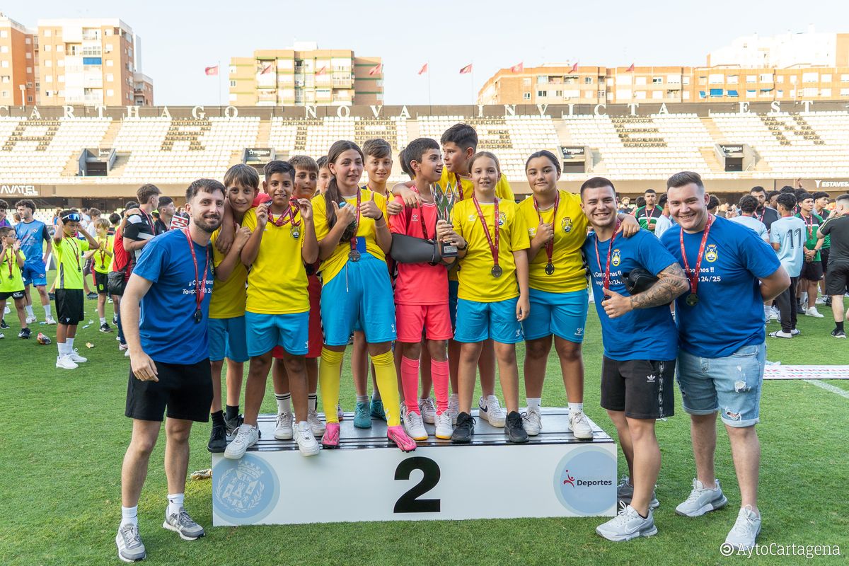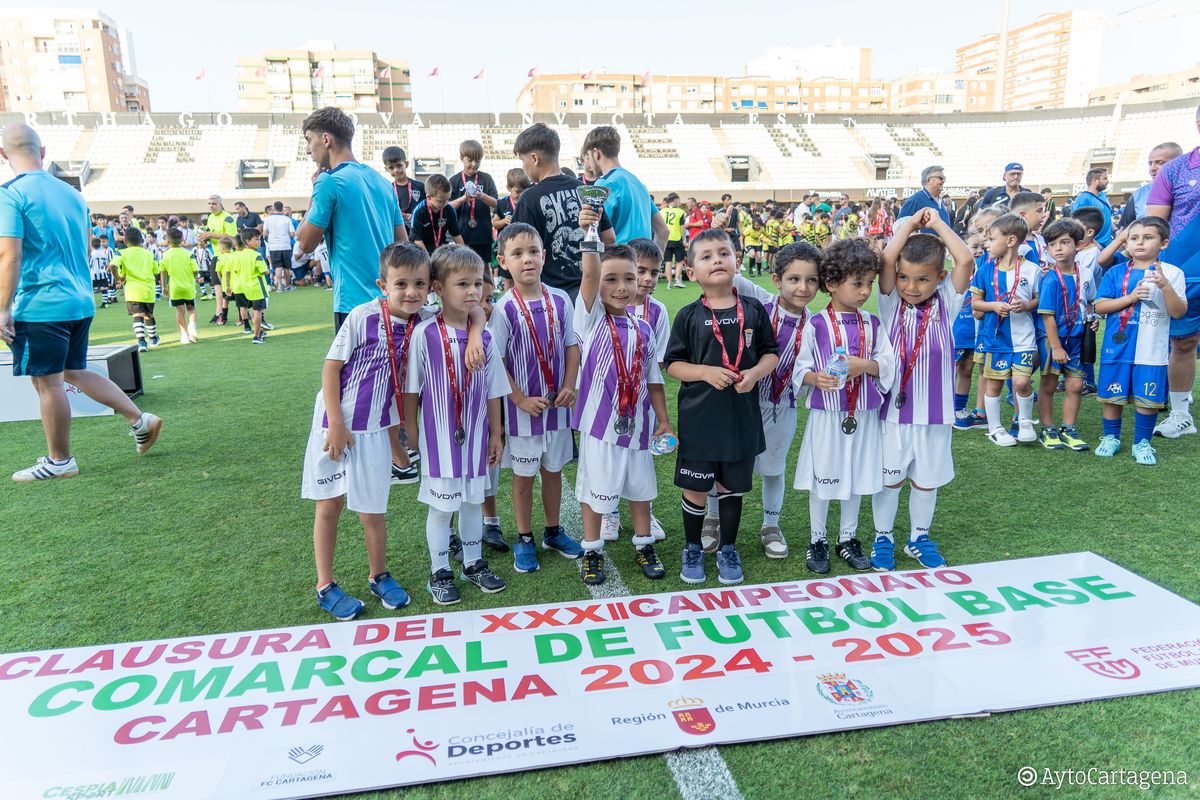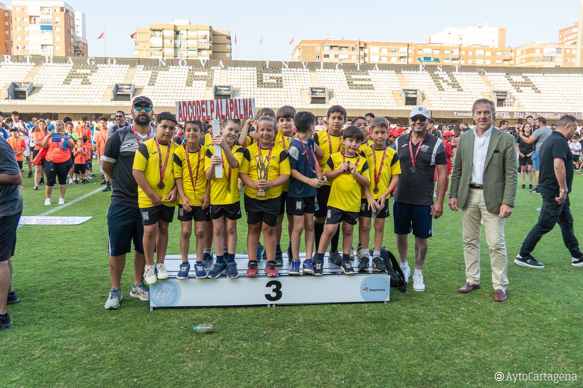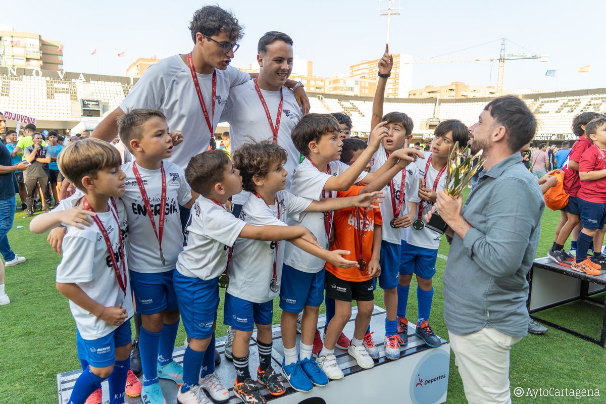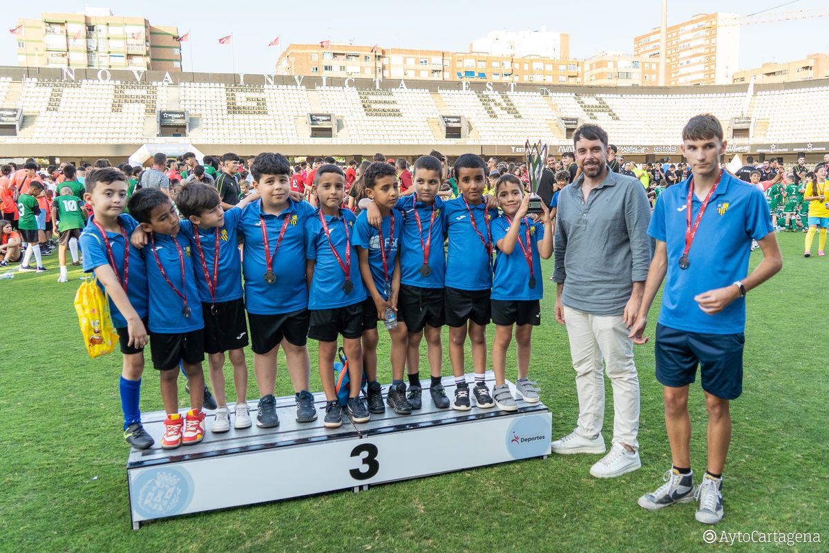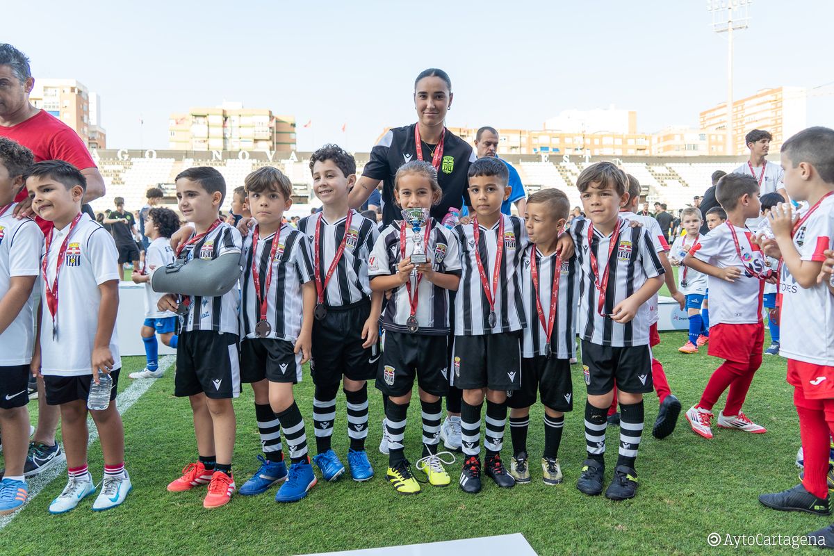 Cientos de chavales participaron en el acto celebrado este jueves en el Estadio Municipal Cartagonova, que incluyó desfiles y exhibiciones, culminando con la entrega de trofeos