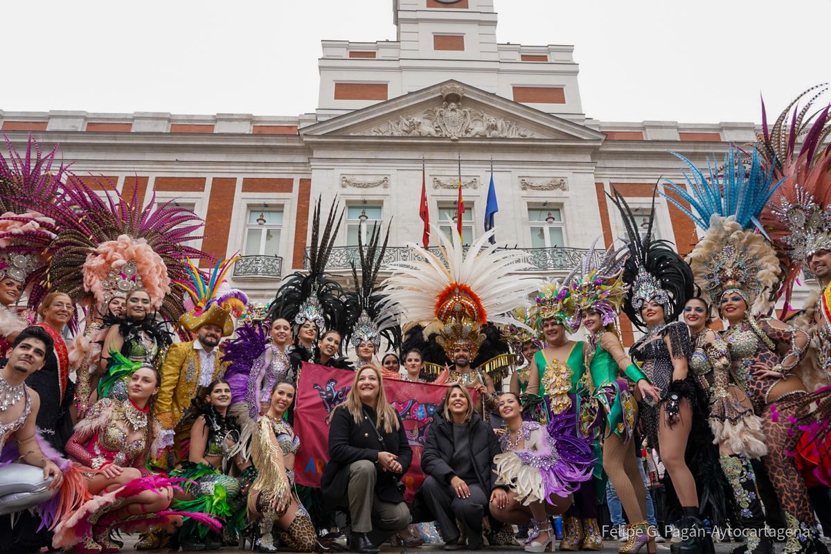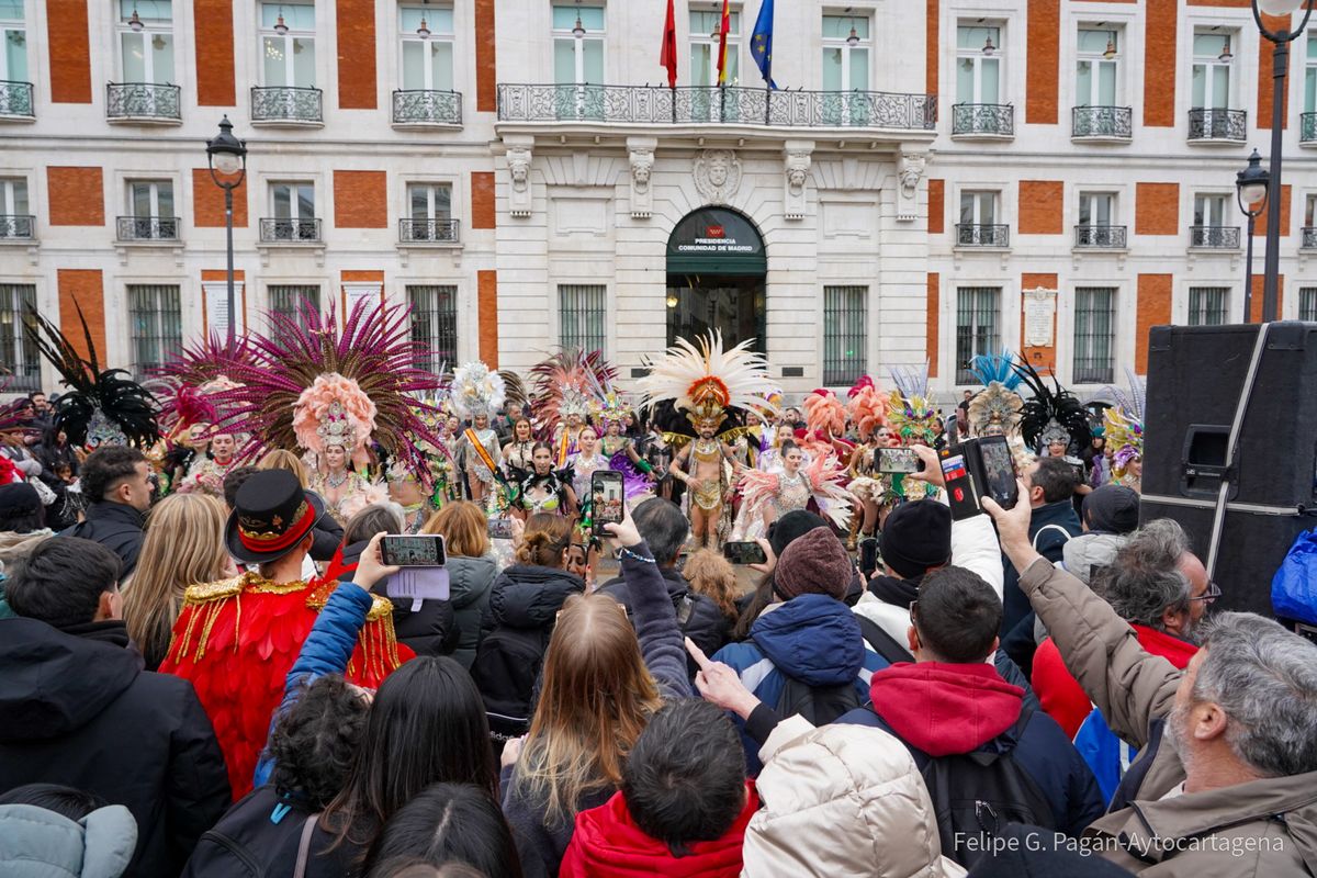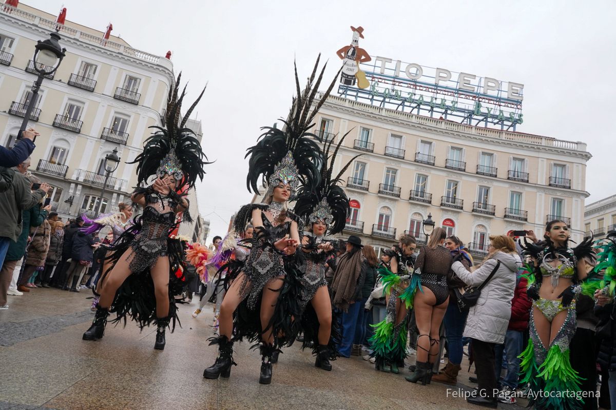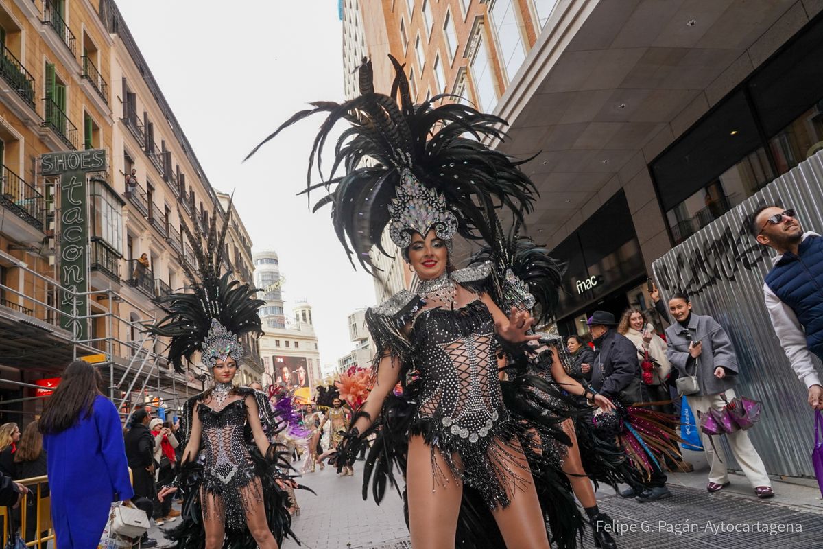 Enmarcado en las actividades organizadas por el Ayuntamiento con motivo de Fitur, el colorido y la fantasía de la fiesta cartagenera han recorrido este viernes una de las zonas más céntricas de la capital