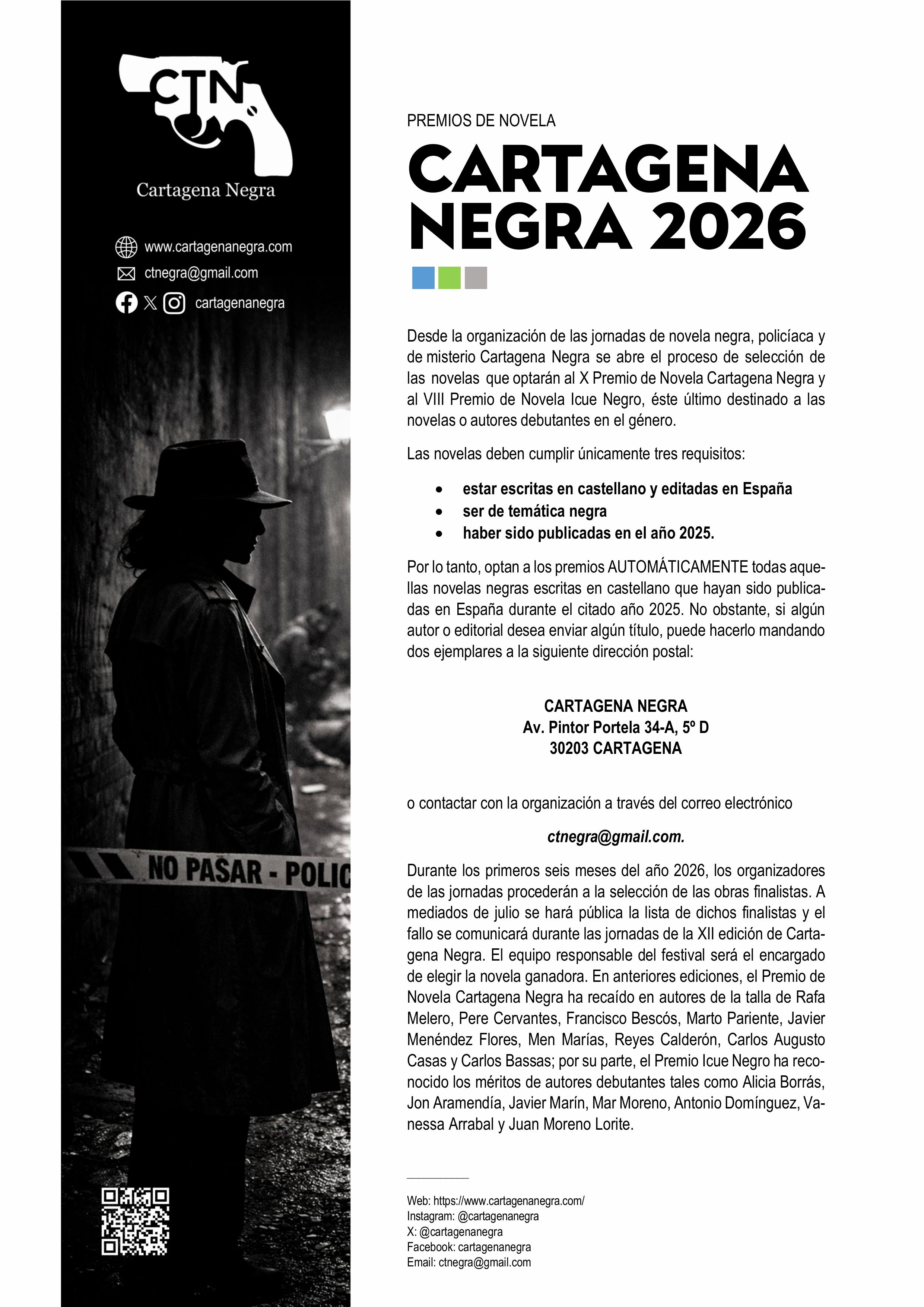 Este nuevo premio dedicado a los autores juveniles se suma al resto de galardones de Cartagena Negra. Las jornadas dedicadas a la literatura negra han hecho públicas las bases de sus tres premios principales, dos en el ámbito de la novela (uno de ellos, Icue negro, para debutantes) y otro dedicado a los cortometrajes. Toda la información está disponible en la web www.cartagenanegra.com y en los documentos adjuntos a esta noticia.
