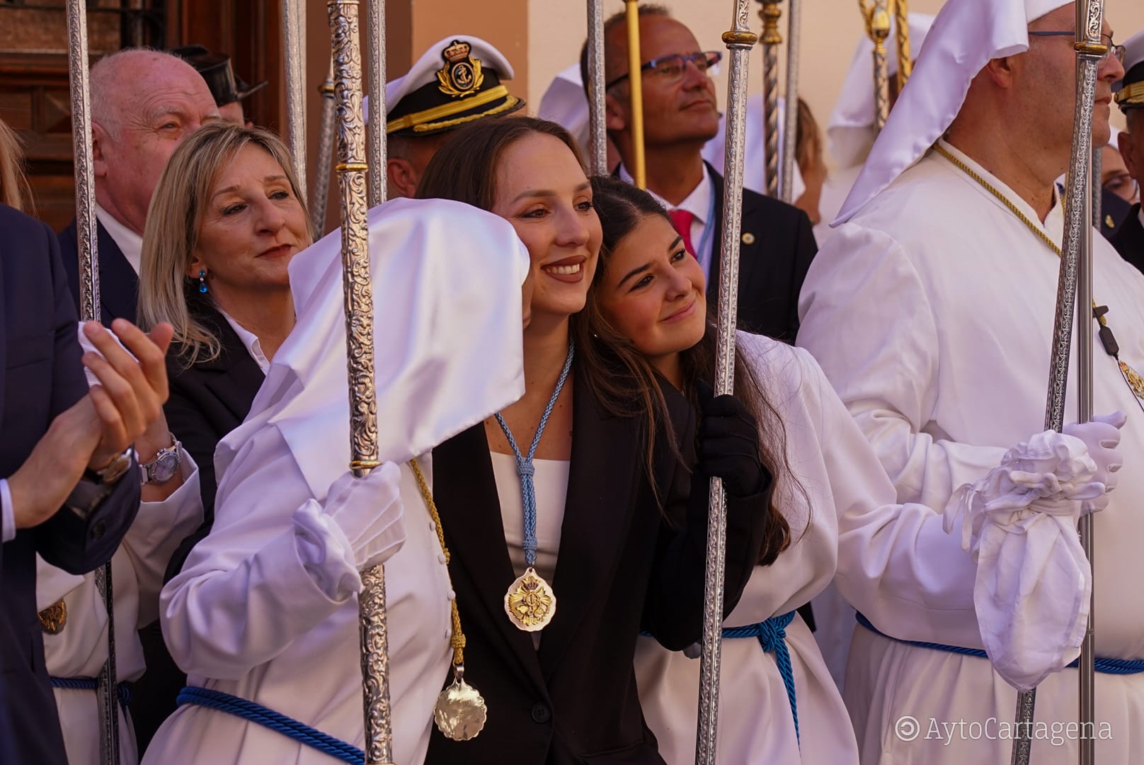 La alcaldesa de Cartagena, Noelia Arroyo, junto a la hermana mayor de la cofradía, Marién García Boj, han asistido a los momentos previos de la salida, donde se respira el entusiasmo de los cientos de procesionistas que cierran la Semana de Pasión.