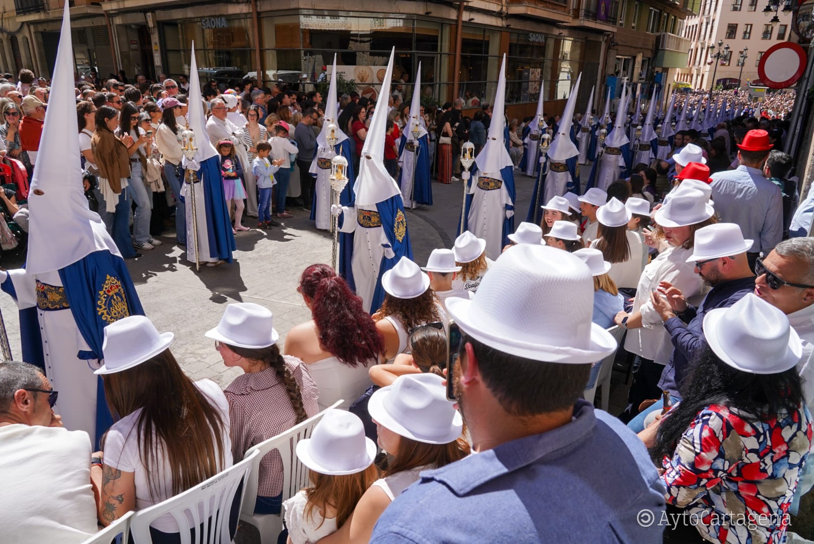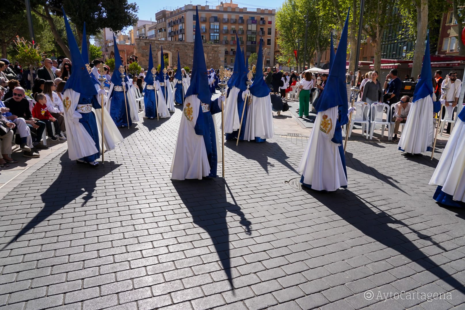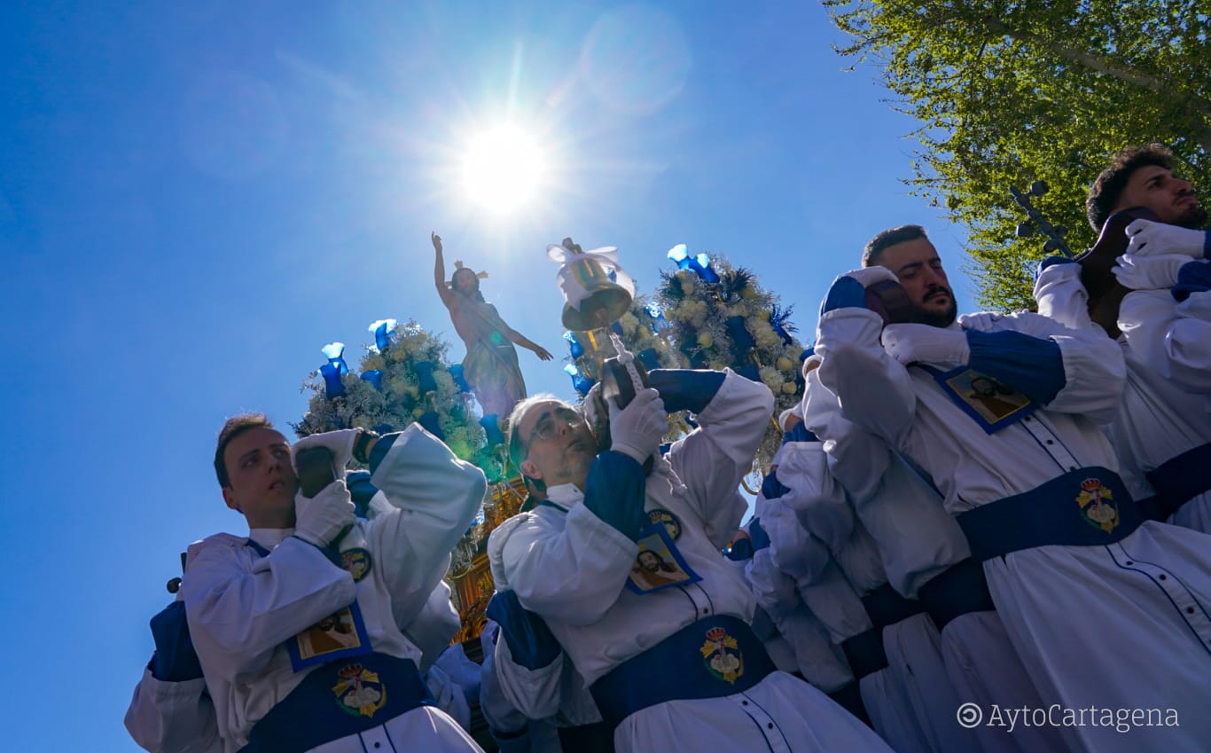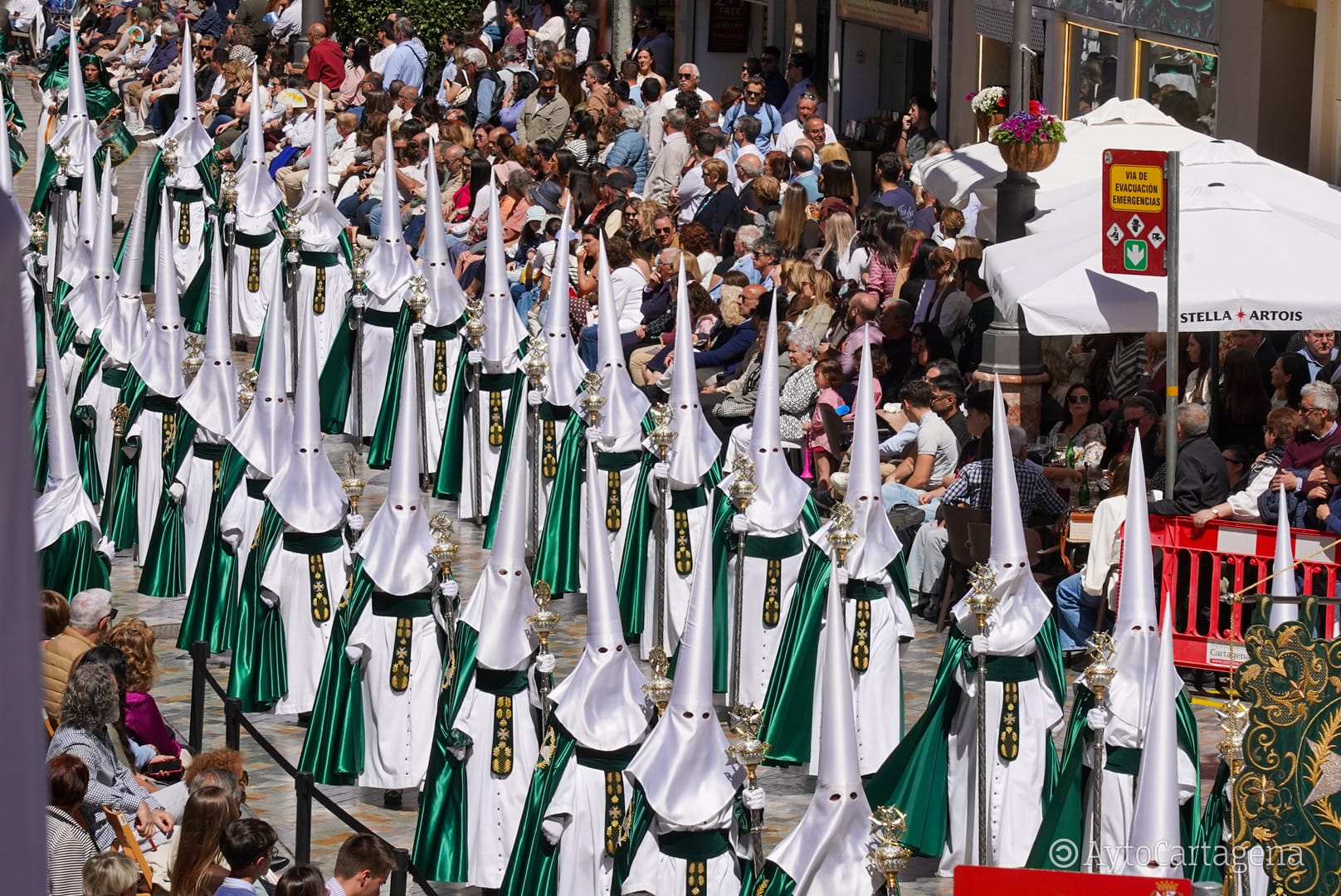 Cartagena ha despertado con el repique de campanas y el blanco radiante de la Real e Ilustre Cofradía de Nuestro Padre Jesús Resucitado, devolviendo a las calles la luz y la esperanza en el desfile más alegre de la ciudad.