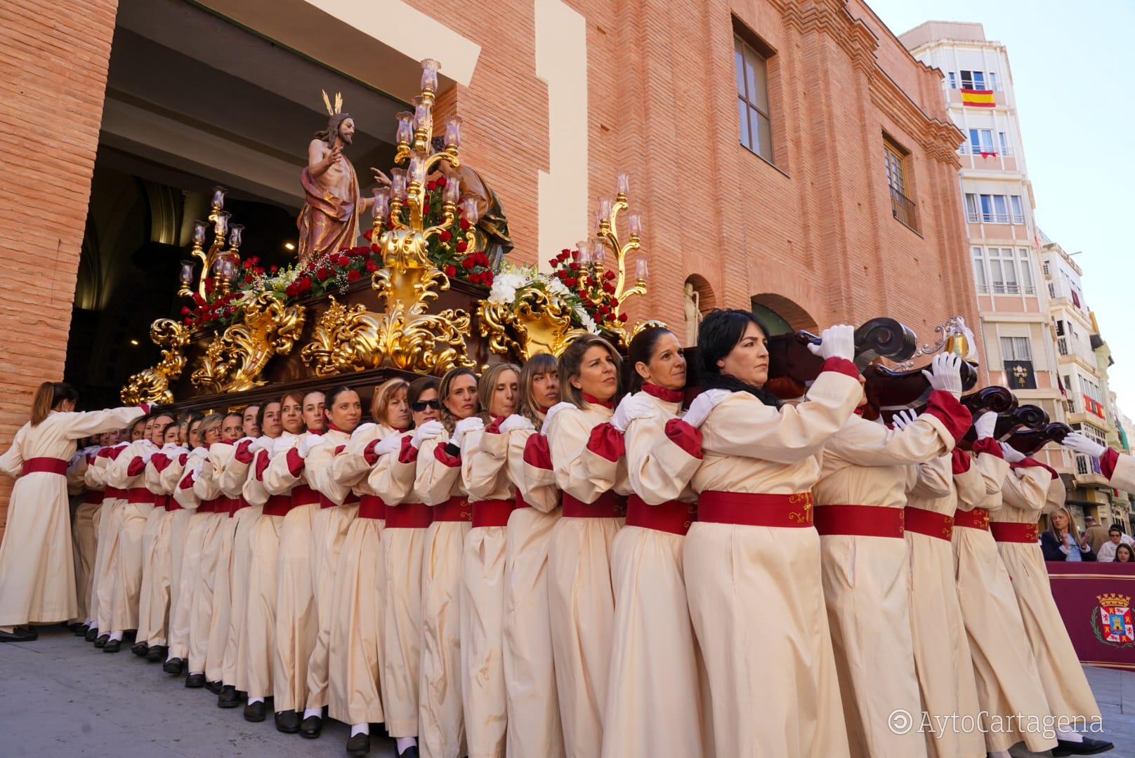 La alcaldesa se une a las damas portapasos de la agrupación de Santo Tomás para cargar la imagen en una jornada marcada por la alegría y la luz