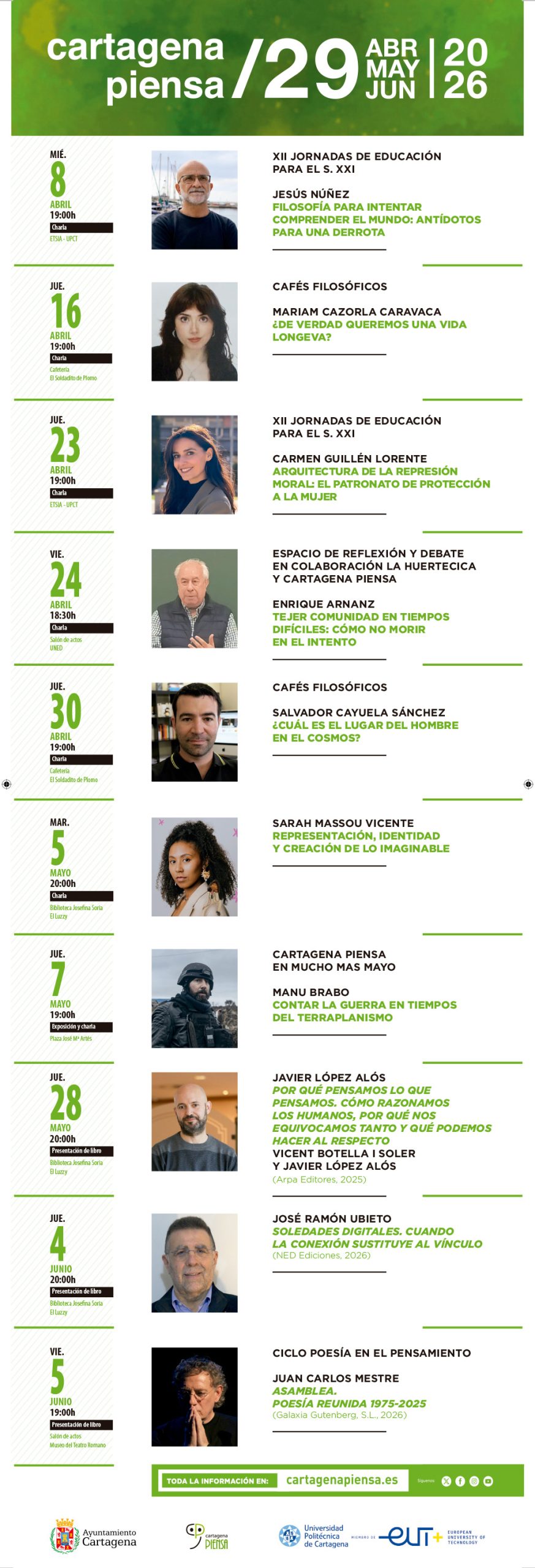 Cartagena Piensa lanza la programación de su 29ª edición, que ofrecerá hasta finales de junio más de una treintena de propuestas con las que fomentar el debate colectivo. Artistas, poetas como Juan Carlos Mestre; fotoperiodistas como Manu Brabo, ganador del Premio Pulitzer en 2013; escritores como Pedro Olalla, divulgadores, filósofos o ensayistas como Javier López Alós pasarán por el municipio este trimestre. Todos los detalles están disponibles en el programa, adjunto a esta noticia, así como en la sección Agenda Ciudad de la web municipal y en www.cartagenapiensa.es