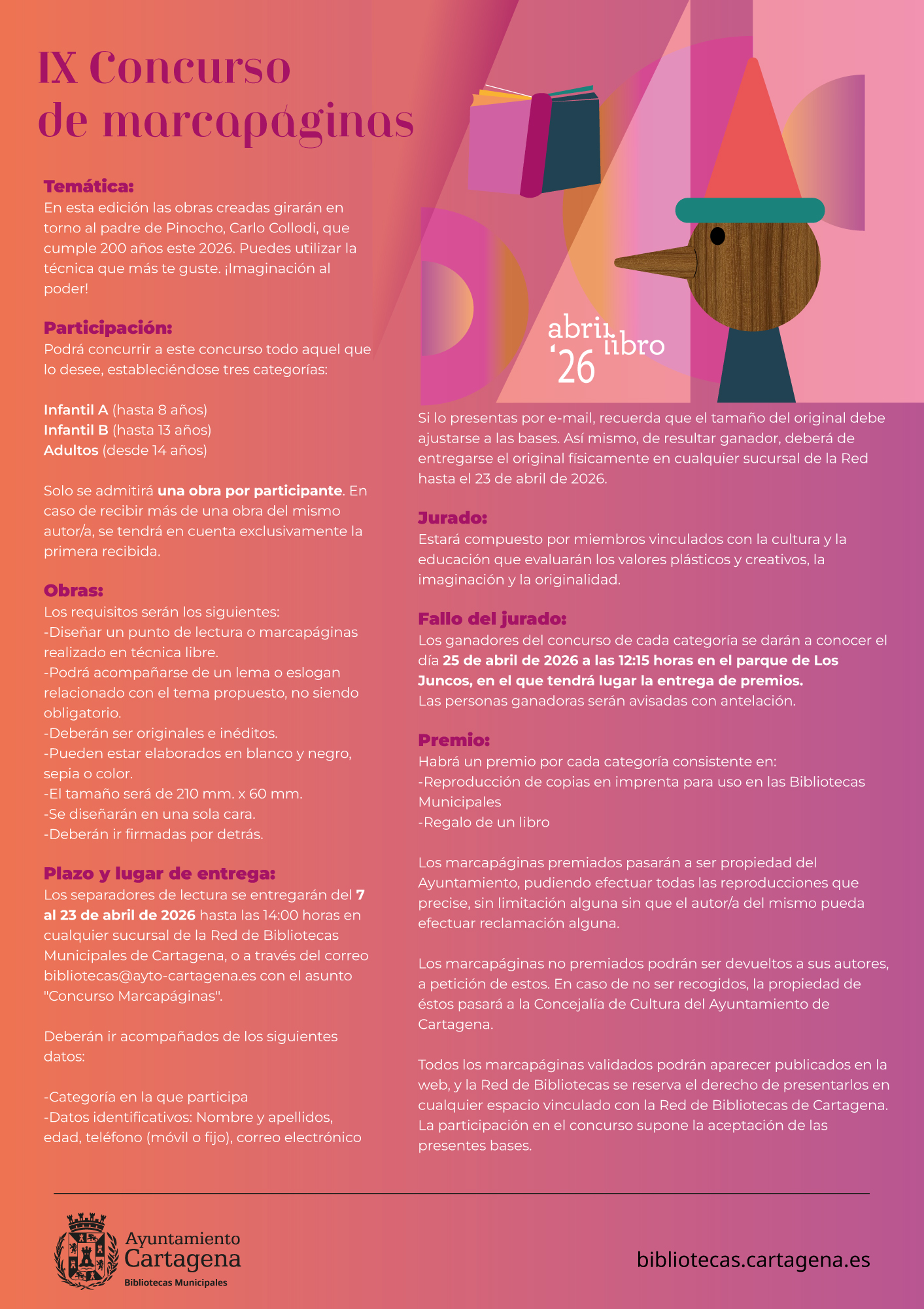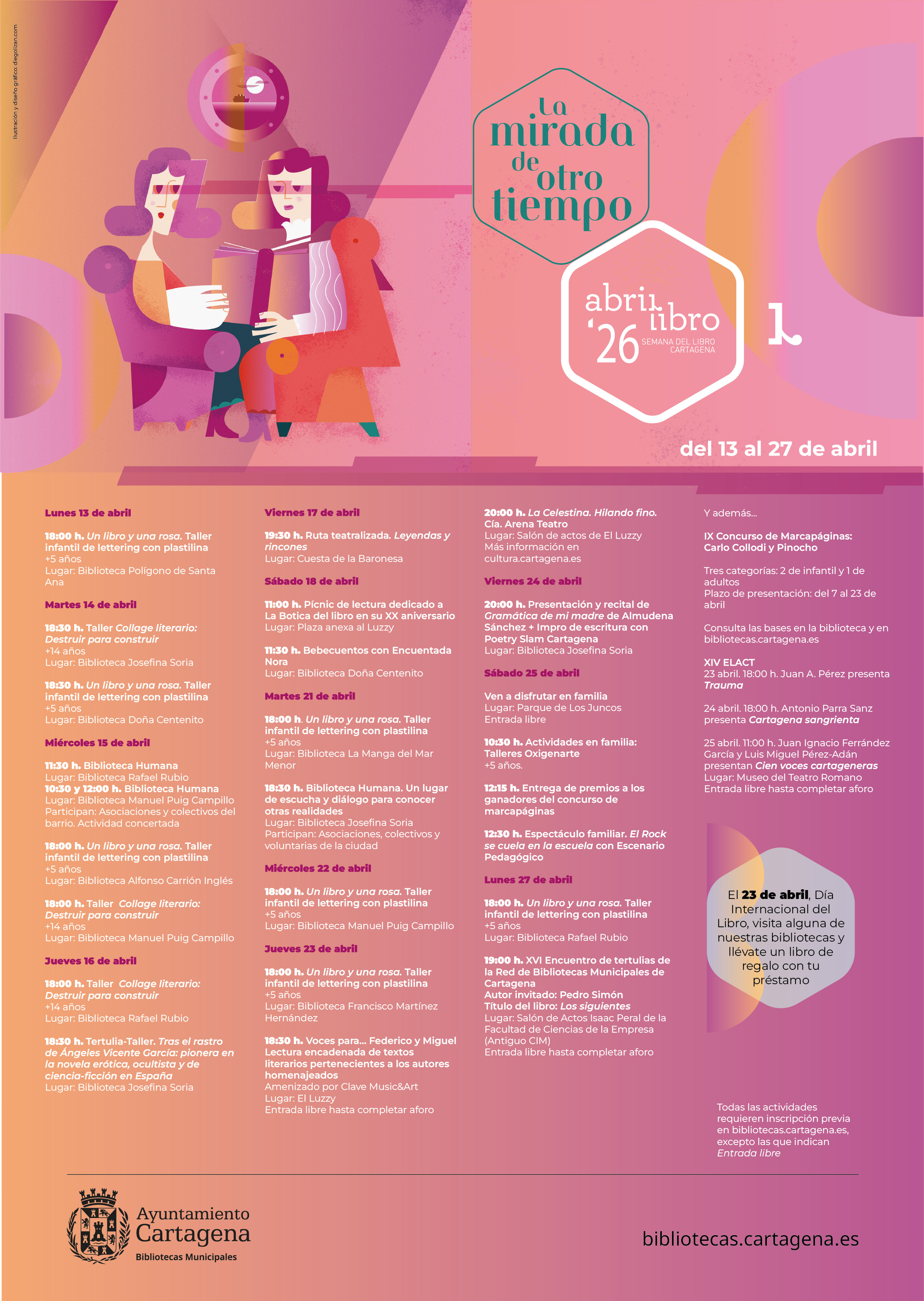 Además de estas actividades, se celebrará el tradicional concurso de marcapáginas, dedicado este año a Carlo Collodi, autor de Pinocho, por el centenario de su nacimiento; una ruta teatralizada sobre las leyendas y rincones de Cartagena, talleres para adultos y para público infantil, como el de lettering con plastilina, o las actividades Ven a disfrutar en familia, con talleres creativos, pintacaras, juegos y animaciones, además del espectáculo musical El rock se cuela en la escuela, que se realizará el próximo 25 de abril en el parque de Los Juncos.