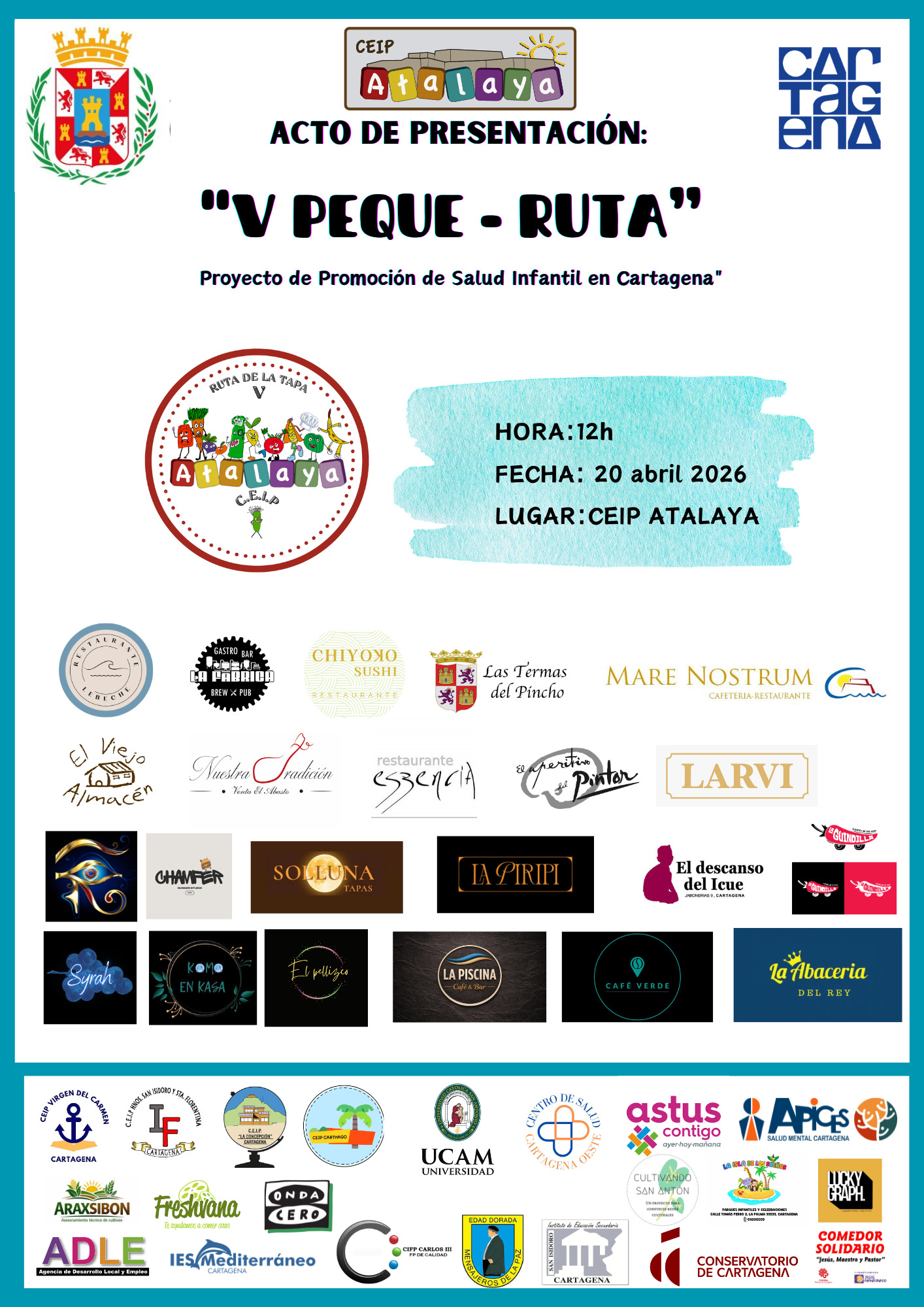 El Ayuntamiento ha presentado la ruta de la tapa infantil “V Peque Ruta”, un proyecto orientado a la promoción de hábitos de vida saludables entre la población infantil de Cartagena. La iniciativa está organizada conjuntamente por el Área de Educación del Ayuntamiento de Cartagena y el CEIP Atalaya, con la colaboración de otras áreas municipales como Comercio y ADLE, así como de entidades y organizaciones como la UCAM, el Conservatorio de Música de Cartagena, ASTUS, Ápices Salud Mental, el Centro de Día Mensajeros de la Paz, la asociación Cultivando San Antón, el Comedor Social de Cáritas, además de diversos centros educativos del municipio. El acto de presentación ha tenido lugar en el CEIP Atalaya, con la asistencia de representantes de las entidades colaboradoras y numerosos familiares del alumnado participante.
